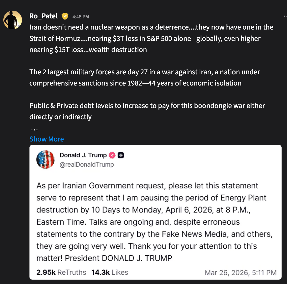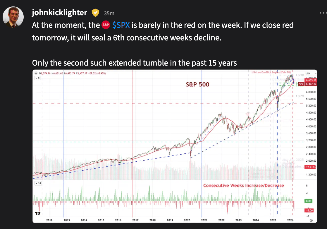 Thursday โ๏ธ: Markets slid to a multiโmonth low as oil pushed back above $100 and the Iran war timeline stretched again, keeping energy green and the rest of the tape red. Social media names were hit by landmark addiction liability verdicts that put Section 230 protections in play, while semis sold off hard on Googleโs TurboQuant memoryโcompression breakthrough and renewed capex doubt. Risk appetite stayed thin into Fridayโs data, with tech, adโtech, and discretionary the main casualties.