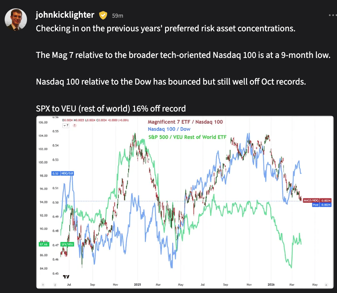 Wednesday [RiskโOn]: Stocks rose broadly as Armโs move into selfโbuilt chips and Jensen Huangโs AGI comment reignited the semiconductor trade, lifting AMD, Intel, Marvell, and hardware names while energy lagged. Oil pulled back on mixed warโpause messaging, but the conflict stayed unresolved as Iran floated its own Hormuz terms and the U.S. kept paratroopers in play, keeping the relief rally fragile. The S&P, Nasdaq, and Russell all closed green, with chips, biotech, and AIโadjacent proxies taking the lead while a few consumer and dataโanalytics names sagged.
